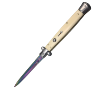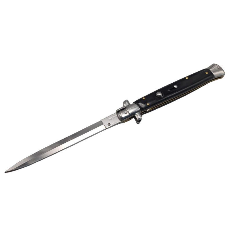 Den automatiska italienska stilettkniven har en fantastisk vintage-look som kommer att uppskattas av knivsamlare och ett massivt blad som kommer att få jobbet gjort. Det går snabbt och enkelt att använda det rostfria bladet när du trycker på knappen på handtaget. Handtagsvågen kompletteras med polerade bolster i rostfritt stål. Den övergripande 13″ stilettkniven kan förvaras i den medföljande nylonpåsen.